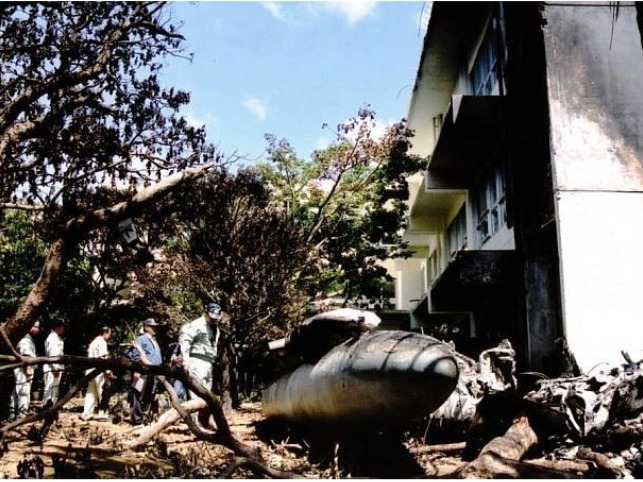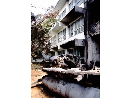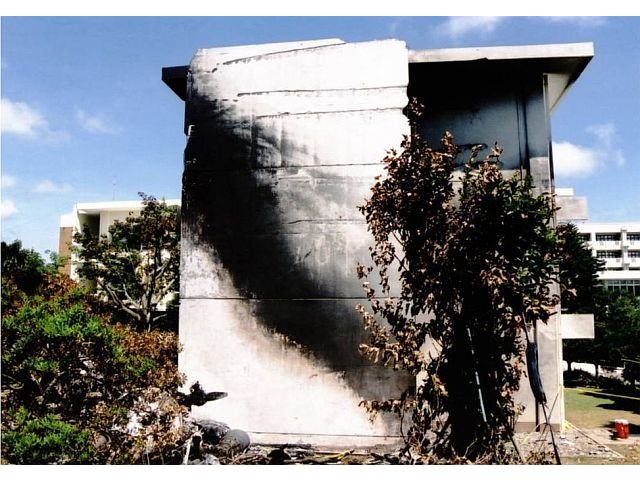 ![]() 爆発炎上により悲惨な姿に化した本館 | ![]() プロペラにより横筋として傷が残る | ![]() CH-53コクピット部分 | ![]() CH-53ローター部分 |
