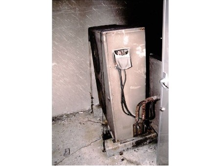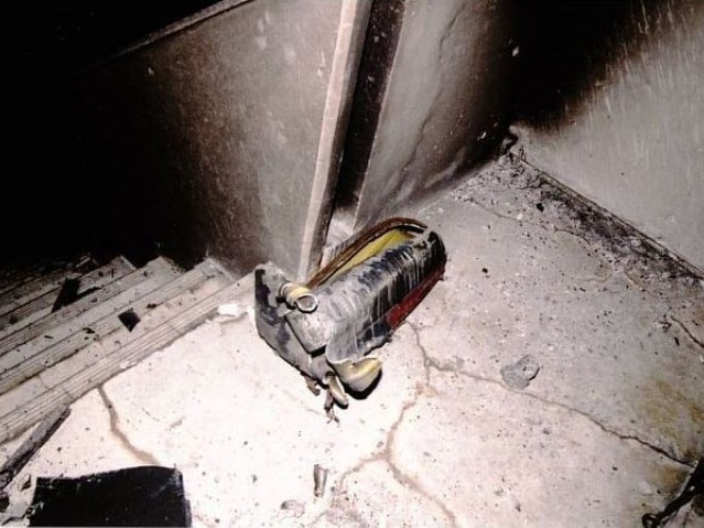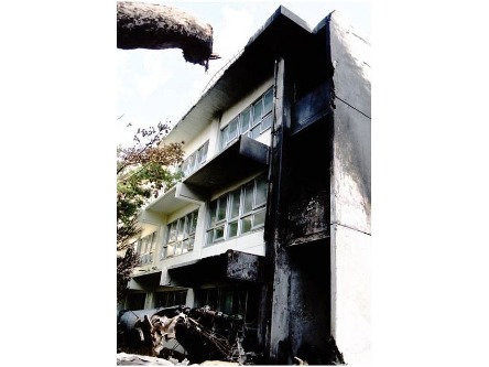 ![]() 学長室側の非常口は焼け溶けた | ![]() 衝撃の凄さを物語っている職員労組会議室 | ![]() 非常階段にも機体の一部が散乱 | ![]() クーラーの室外機も焼け溶けた |