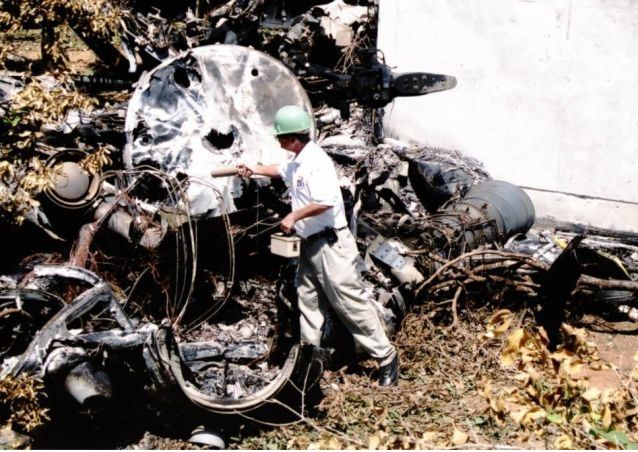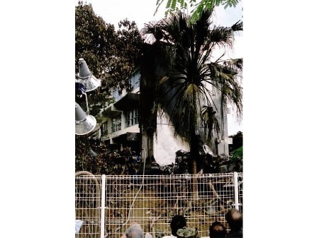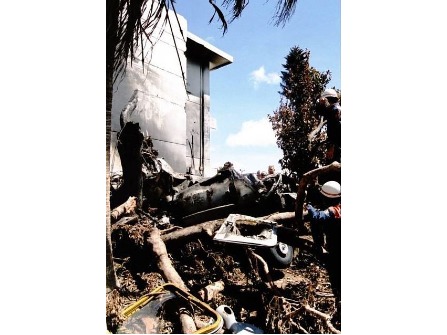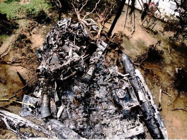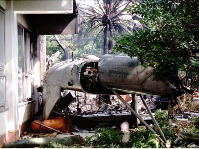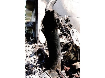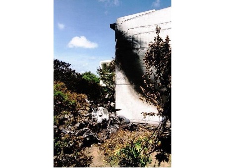 ![]() この部分に激突した | ![]() 完全に破壊したCH-53本体 | ![]() 道路側から | ![]() CH-53ドアが溶けている |