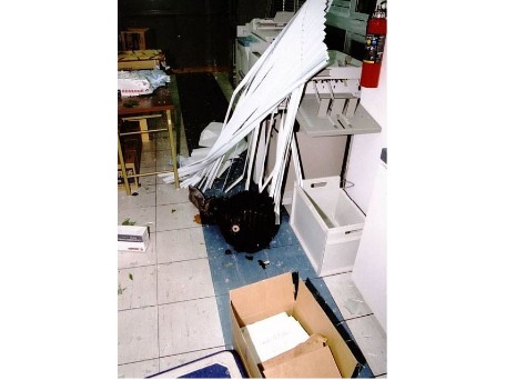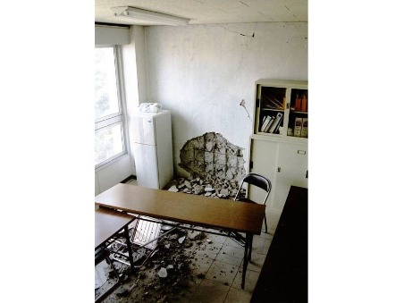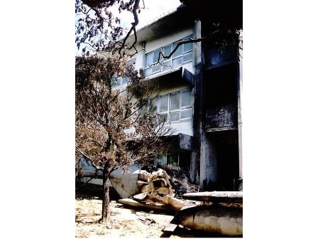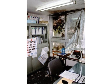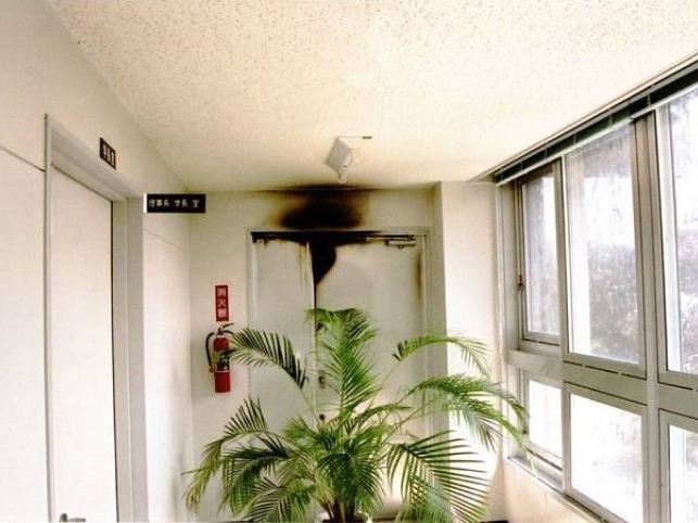 ![]() 中庭から | ![]() 会計課との間が50cm… | ![]() 防音ガラスが割れ炎が入ってきた会計課 | ![]() 爆風によりブラインドが吹き飛ばされた会計課 |