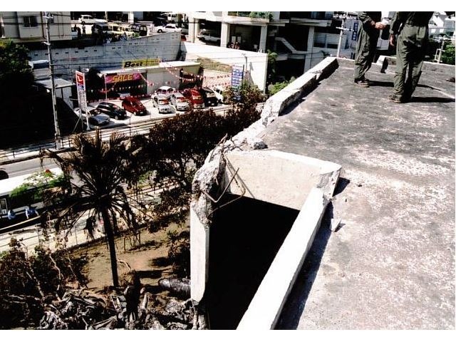 ![]() CH-53ローター部分 | ![]() 後部が本館会計課横に激突 | ![]() 爆発炎上で破壊された非常階段 | ![]() CH-53燃料タンク |