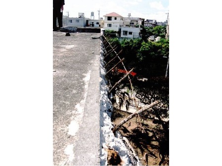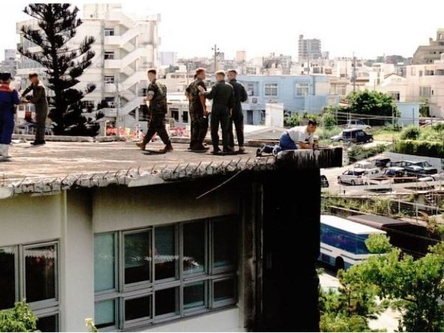 ![]() CH-53燃料タンク | ![]() 庶務課方向から | ![]() 事故現場を視察する米兵 | ![]() プロペラで庇が削り取られた |