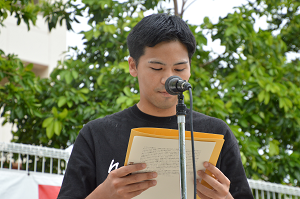 また、学生を代表し法学部法律学科4年次の新垣里奈さん(コザ高校出身)と法学部地域行政学科3年次の牧志和哉さん(浦添高校出身)による、意見発表が行われました。