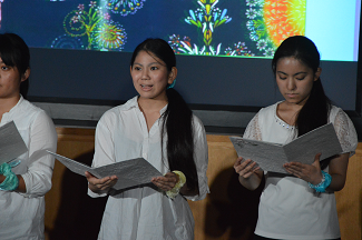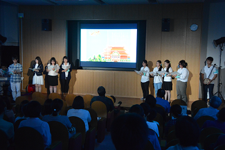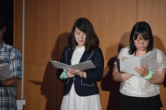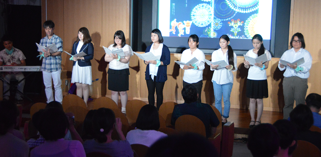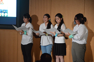 第二部では、図書館4階AVホールにて昨年に引き続き学生による沖縄戦や本学米軍ヘリ墜落事件、宮森小学校米軍機墜落事件などの証言やそれを題材にした絵本の朗読劇『8.13朗読ライブ「VOICE」2016 ~ぼくらが繋ぐ明日へのバトン~』を開催し、約70名の参加がありました。