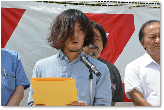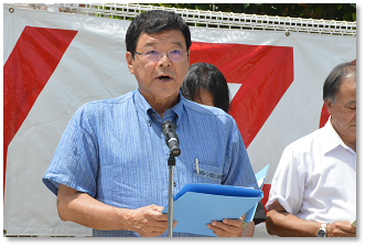 第一部の本学ポケットパーク(ヘリ墜落現場モニュメント)で開催された集いでは、暑い中約170名の参加がありました。集いは、小柳正弘副学長による趣旨説明のあと、前津榮健理事長・学長による普天間飛行場の閉鎖・撤去を求める旨の声明が発表されました。