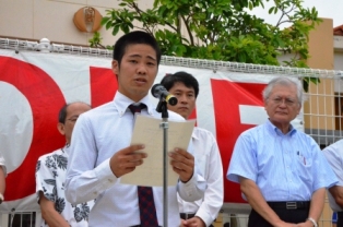 第一部のポケットパーク(ヘリ墜落現場モニュメント)前にておこなわれた集いには、およそ225名の参加者がありました。集いでは、理事長・学長の大城保より普天間飛行場の撤去・返還を求める旨の声明が発表されました。また、学生を代表して、経済学部2名の学生による意見発表もおこなわれました。