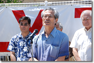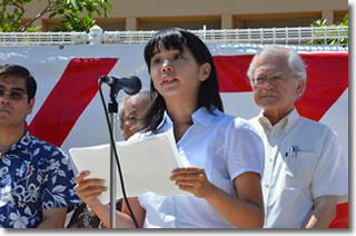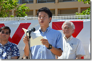 第一部のポケットパーク ヘリ墜落現場モニュメント前にておこなわれた集いには、およそ320人の参加者がありました。副学長・狩俣恵一による趣旨説明と挨拶がおこなわれたあと、理事長、学長・大城保により声明が発表されました。また、学生を代表して、法学部2名の学生による意見発表もおこなわれました。