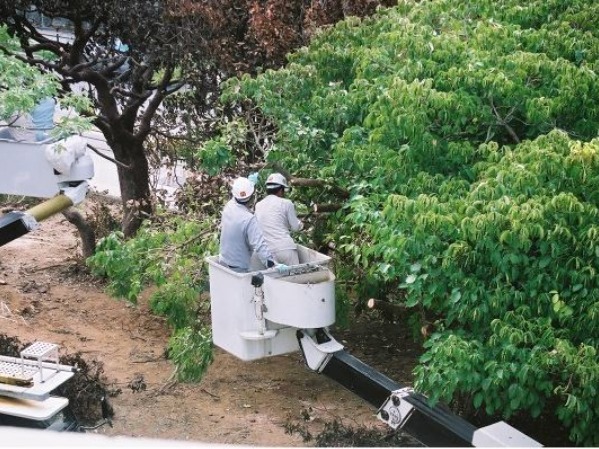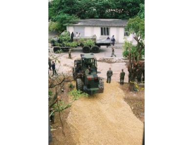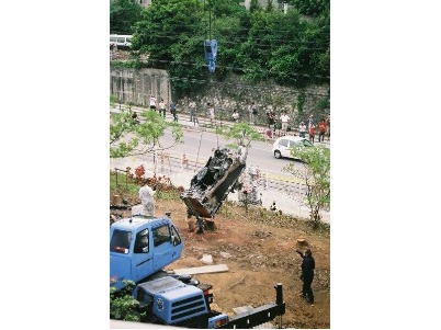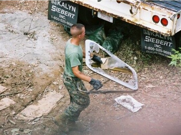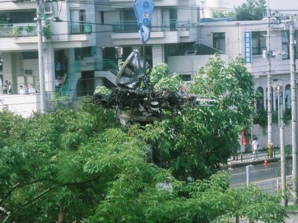 ![]() ヘリ残骸を搬出するため樹木が伐採された | ![]() 搬出用トレーラーのため整地作業をする米軍 | ![]() 搬出:CH-53後部 | ![]() 搬出:CH-53燃料タンク |