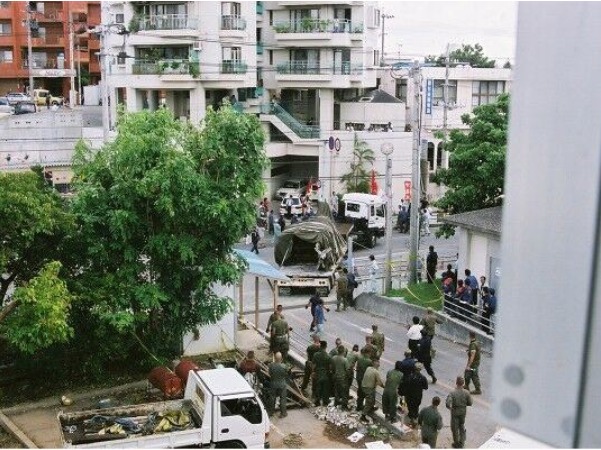 ![]() 搬出:CH-53コクピット窓枠 | ![]() 搬出:CH-53ローター部分 | ![]() 機動隊と学生らがもみ合う中、搬出 | ![]() 防衛施設局等による現場調査 |