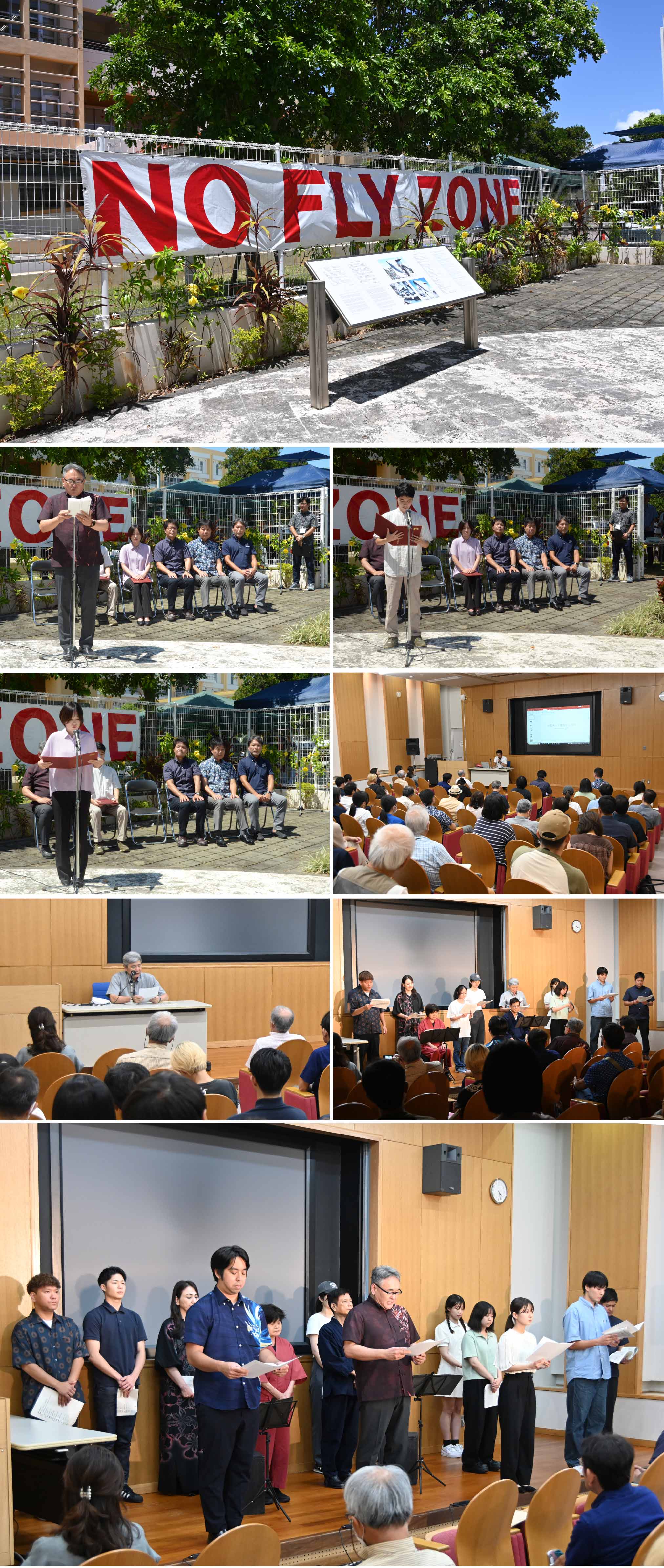 集いでは、安里肇理事長・学長による、普天間基地の閉鎖・撤去を求める旨の声明と、学生を代表し経済学部経済学科3 年次の儀保裕一朗さんと経済学部地域環境政策学科4 年次の謝花美生さんによる意見発表をおこないました。