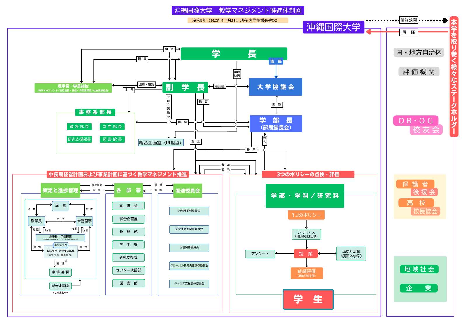 沖縄国際大学では、学生の学修成果について、3つのポリシー(学位授与方針、教育課程編成・実施方針、入学者受入方針)に照らして、下記のとおり検証を行います。