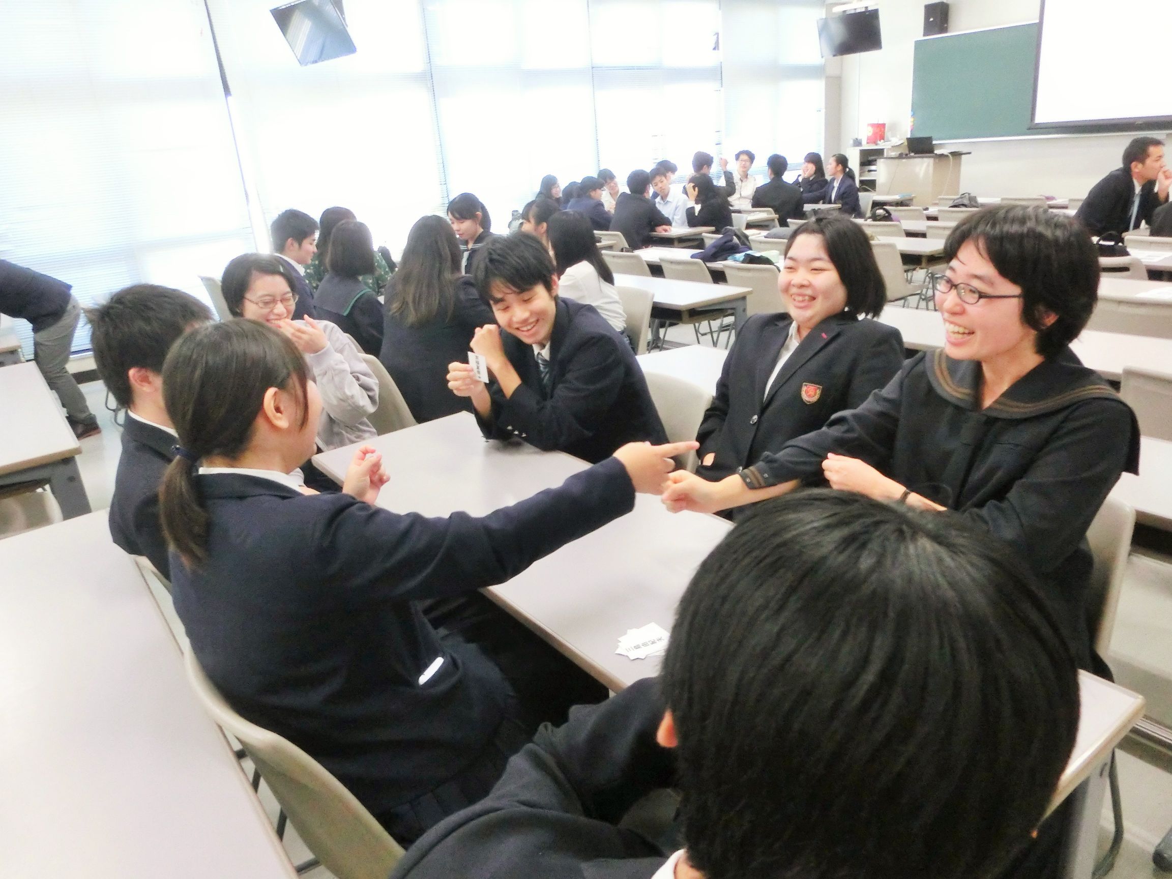 後半は、入学後一緒に学んでいく仲間と少し触れあってみよう、ということで、仲間探しゲームと、私は誰でしょうカードゲームを行いました。