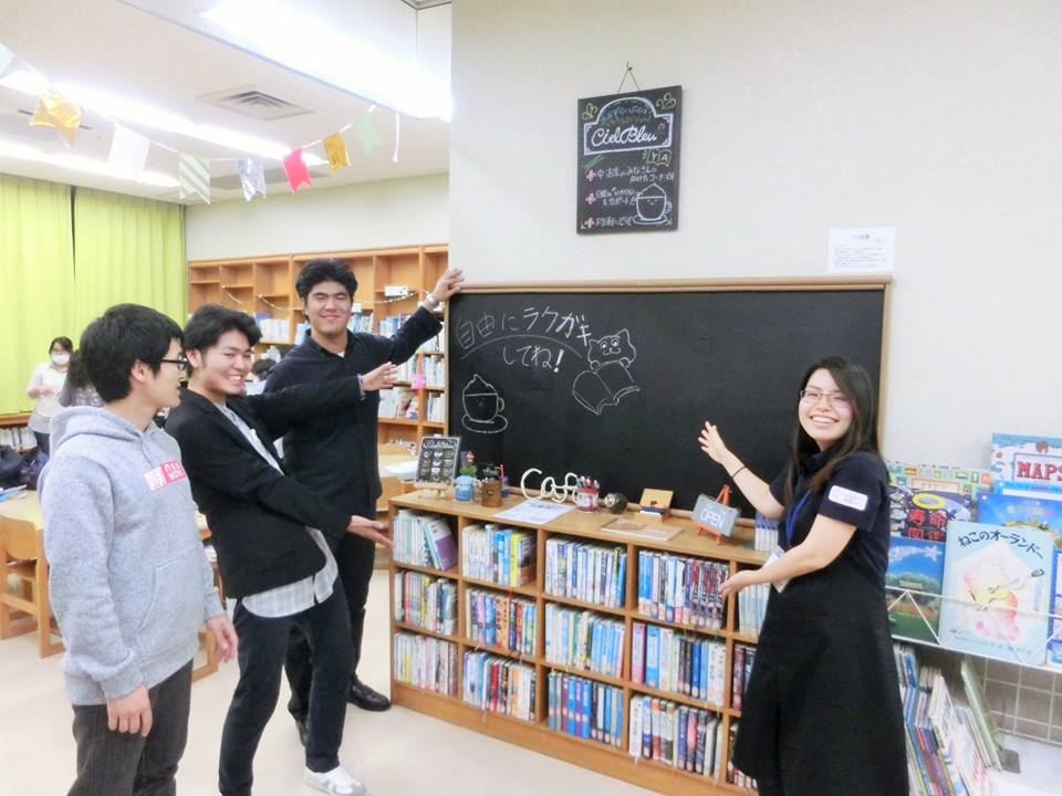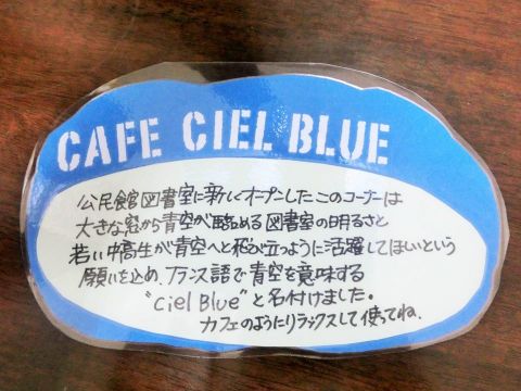 公民館図書室には「あおぞらいぶらりー」という愛称がります。この愛称と、アピールポイントである大きな窓から見える「青い空」を意識し、YA利用者が好むであろう空間「カフェ」と、仏語で「青空」を意味する「シエルブルー(ciel bleu)」という語を組み合わせてコーナー名を考えてみました。