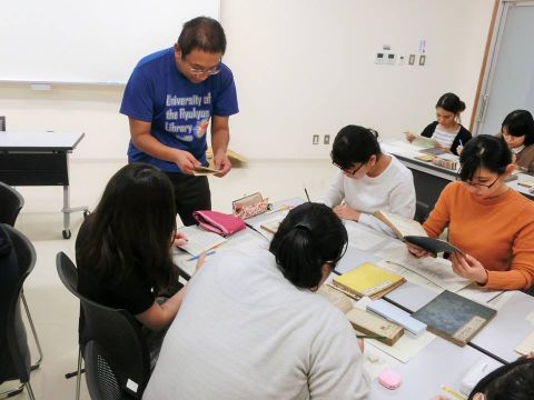 沖縄県内の図書館では、沖縄戦の影響もあって(戦前にあった県内の全ての図書館・資料が消失してしまいましたので)、なかなか古い本を手にすることができないのですが、この日の授業では、東京の古書店から古典籍を取り寄せて、実際に触れてみて、目録を作ってみる体験授業を行いました。