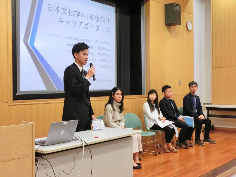 日本文化学科では、1年生の必修科目「リテラシー入門Ⅱ」にて、毎年、専門職として活躍されている卒業生や進路が決まった4年生をゲストとして招いて、仕事の魅力、進路の決定方法、大学時代の過ごし方などをお話しして頂ています。