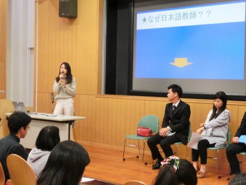「日文での勉強は他の学科のように、その仕事に直結する資格や専門知識は得られないかもしれないけど、逆に、どんな仕事にも縛られない自由さがあると思う。どんな仕事でも日本語の力が問われる。日文だからこそできる就活のやり方もあるので、いろいろな企業にトライしてほしい」