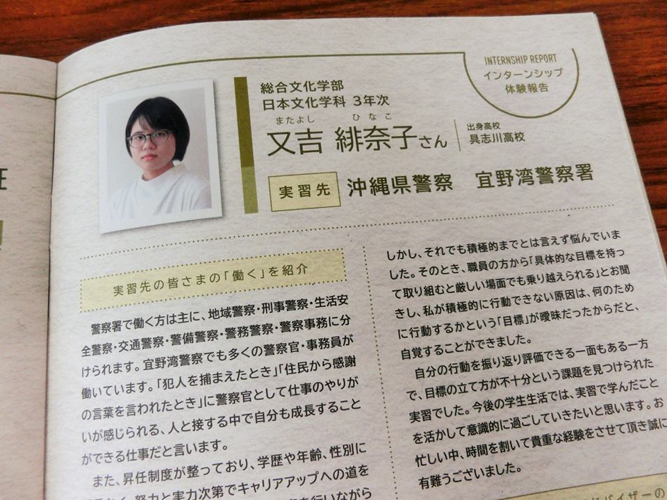 そんな学生たちを代表して、3年生の又吉さんが作成したインターンシップ報告書が、沖縄国際大学学報の最新号に大きく掲載されていたのでこちらでもご紹介します。