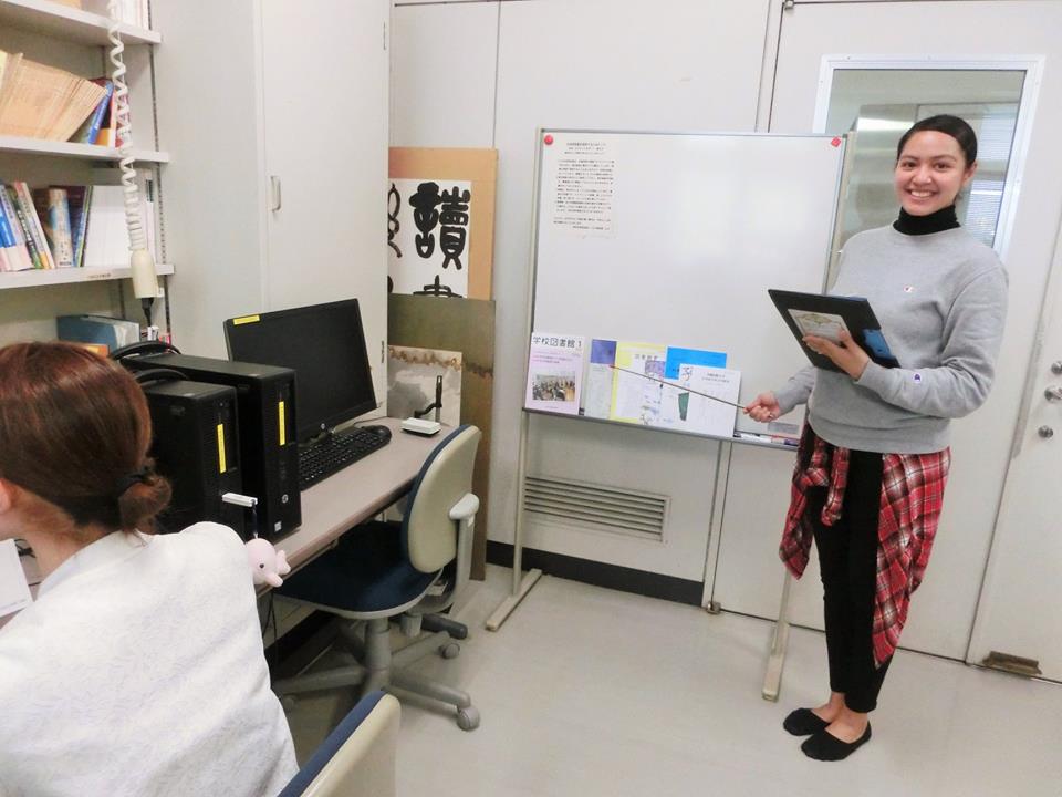 センターでサポートをしてくれているのは、日文3年生から選ばれた4人の在学生。昨年度の優秀レポート表彰者や成績優秀者(特待生)、図書館書評コンテスト入賞者など、学科のカリキュラムやイベントを通して書く力・調べる力を修得した学生さんたちが、後輩へのレクチャーを担当してくれています。
