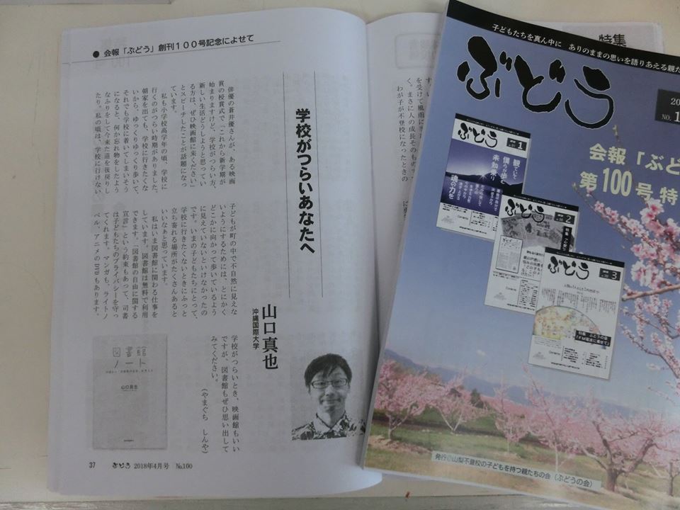不登校児童生徒とその家族への支援を目的として、山梨で活動をしている「ぶどうの会」という団体があります。その団体の100号記念誌に、日本文化学科で図書館情報学の授業を担当している山口真也先生によるエッセイが掲載されれています。