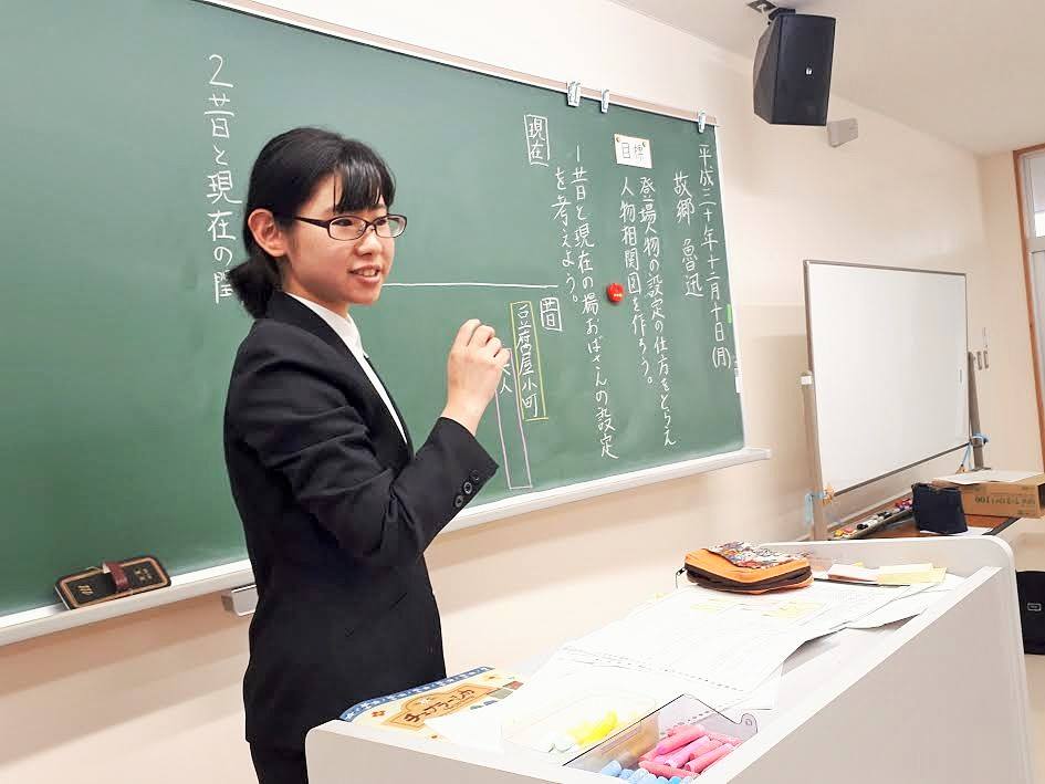 2018年5月15日の授業では、4年生の徳山さんが、桃原千英子先生の指導の下で、模擬授業にのぞみました。教材は魯迅の「故郷」。