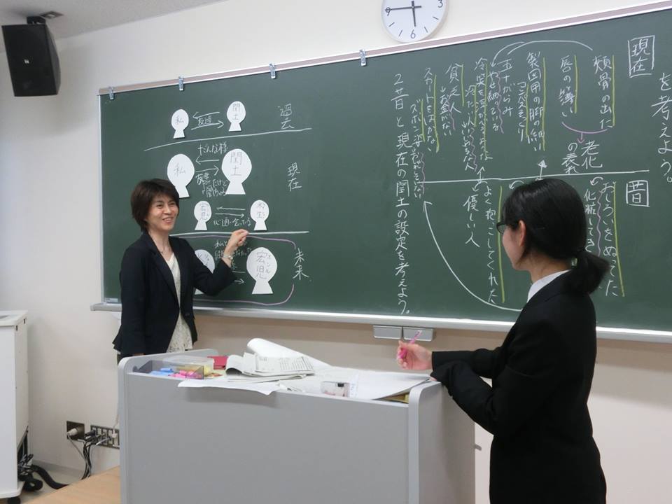授業の作り方を学ぶ「国語科教育法」という科目では、学生が先生役と生徒役をつとめる「模擬授業」を行っています。何週間も前から教材研究を深めて、学生同士で何度も何度もリハーサルをして、1時間の授業にのぞみます。