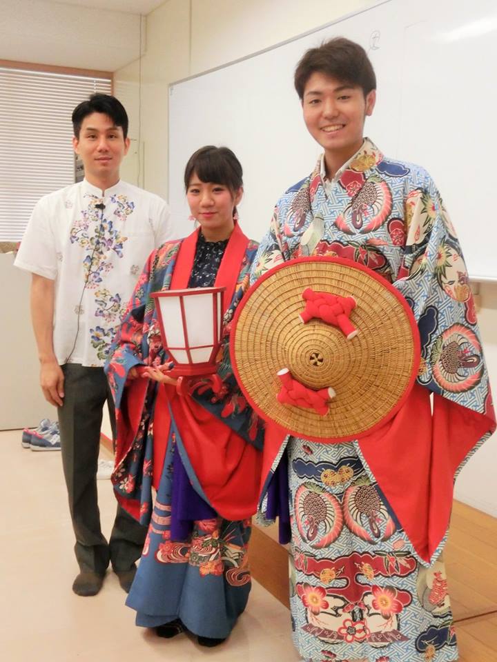 何十万円もする着物や大正時代の帯なども見せていただいたり、先生の指導で学生が演技をしてみたところ、「背中を向けられるのは悲しい」「女主人を振り切る動作は笠を投げるんだ」といった感想や驚きでたいへん盛り上がりました。