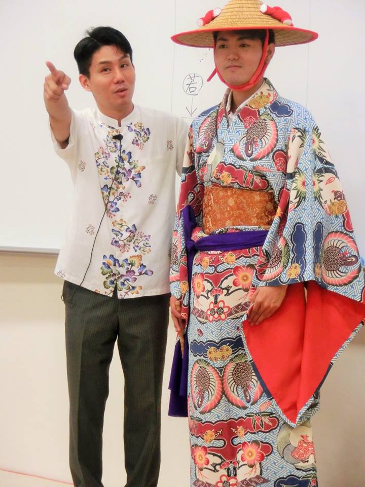 授業の後半では、「執心鐘入」の登場人物である若松と女主人の衣装を学生に身に着けてもらい、舞台上ではどのような衣装を着てどのような所作をするのか、という解説もありました。