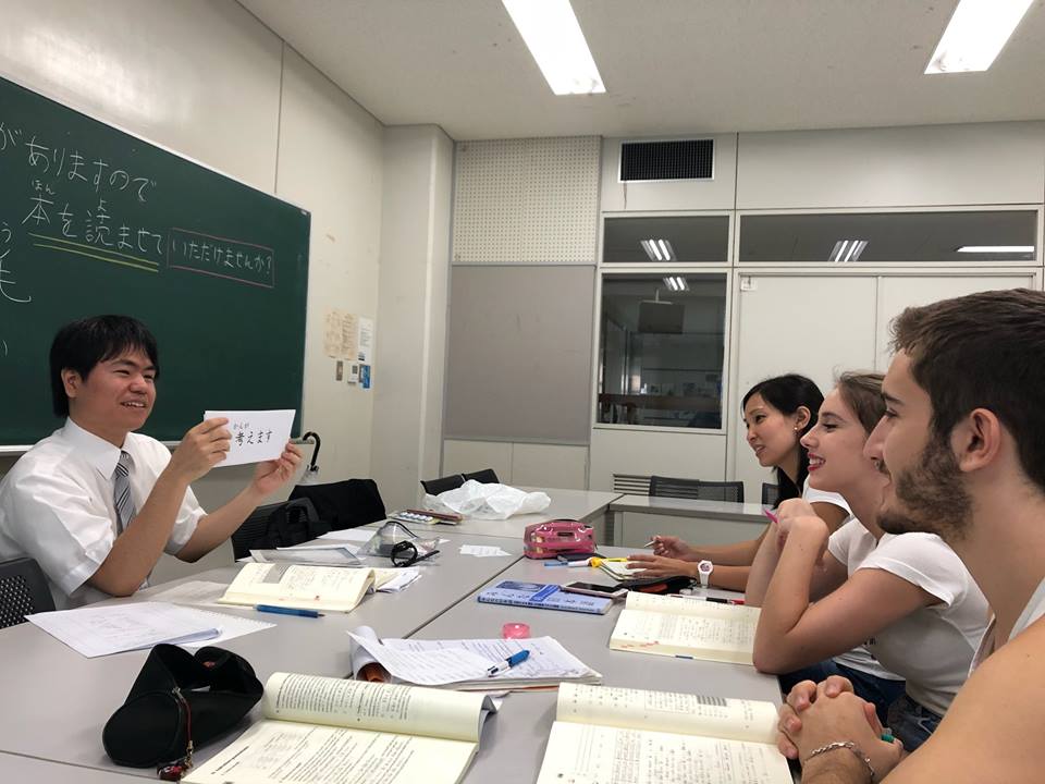 この日は、日本文化学科の4年生、古波蔵さんの教育実習ということで、アルゼンチンとフランスからやってきた3人の留学生に日本語を教える授業を担当しました。