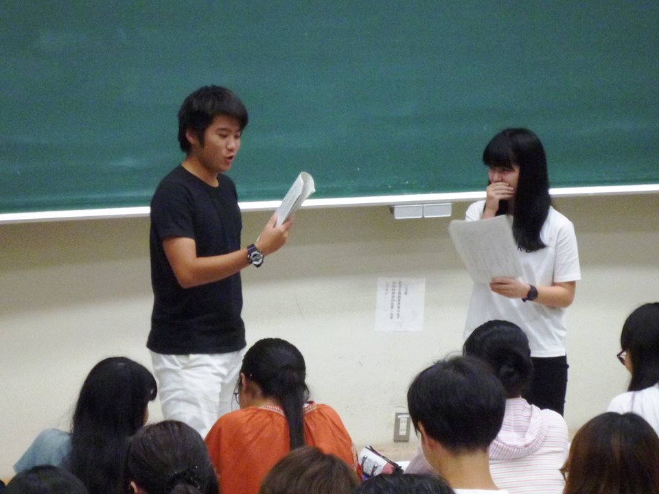 オーディションでは、第一幕・第二幕・第三幕に分かれ、キャスト候補者の2~3名ずつがアピールしていきます。身振り手振り、台詞の抑揚の付け方だけでなく、本番さながらの演技でアピールする学生もいて、「日本語表現法演習」の中で身に着けてきた個性をしっかりと表現できていたように思います。自己紹介で「鬼慶良間役を希望しています!」と熱意を示す学生もいて、とても盛り上がっていました。