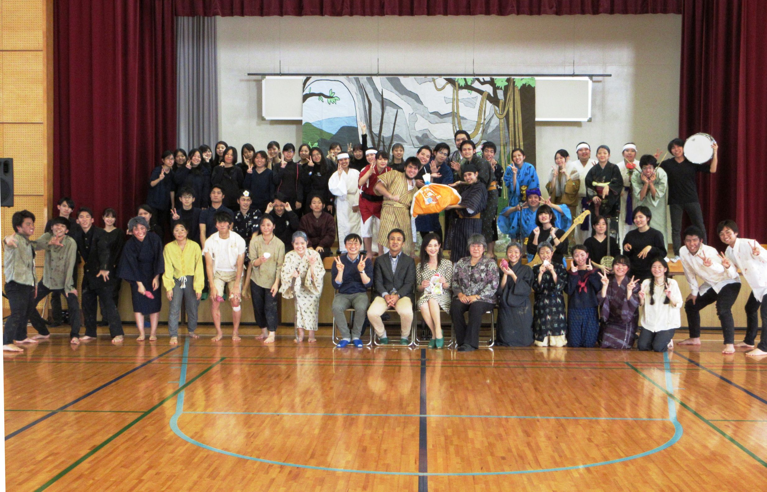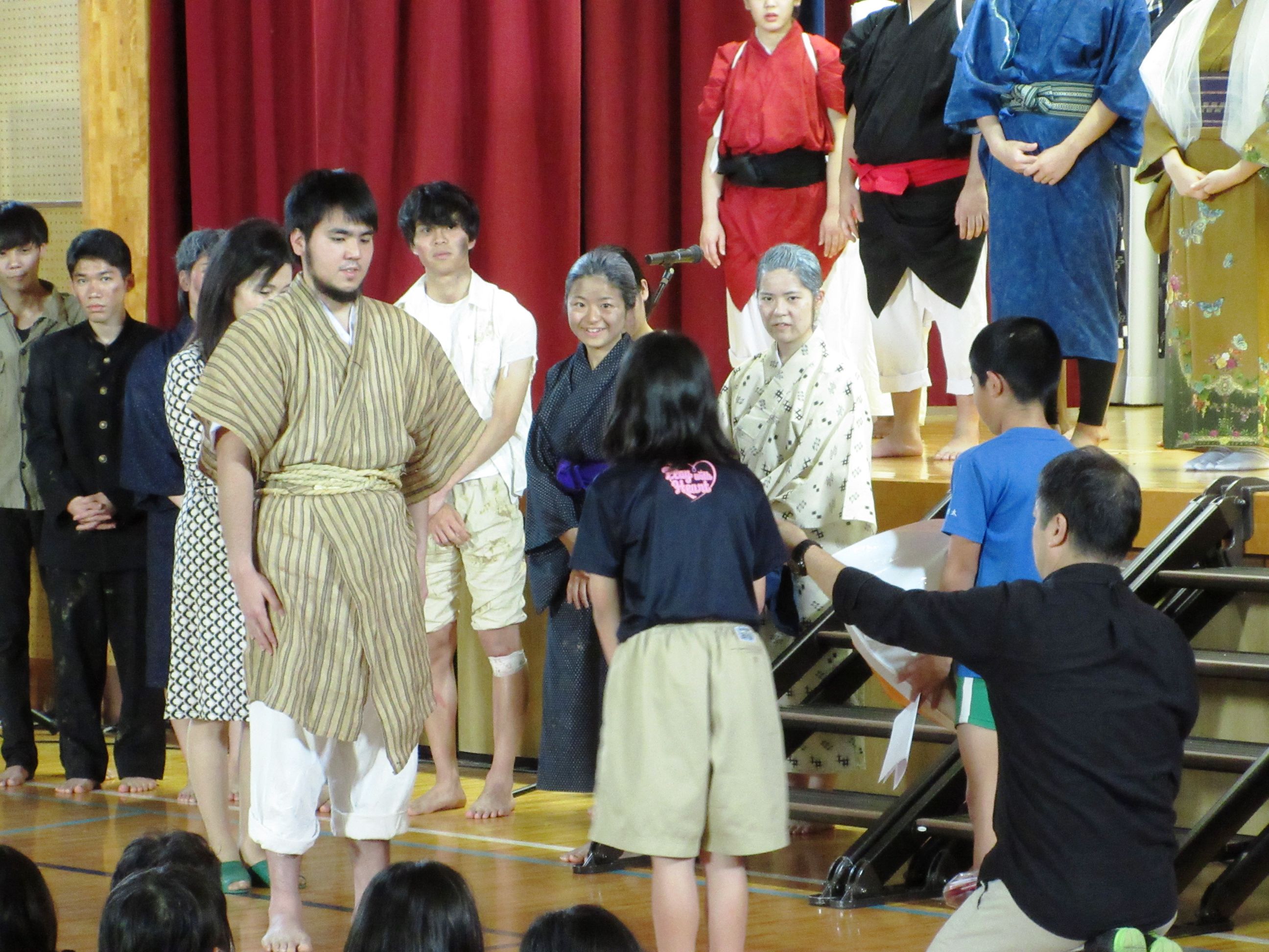 久辺小学校の体育館に、小学校3年生~6年生まで、中学校1、2年生が集まってくれて、楽しい場面には笑顔で、戦争を描く場面では真剣に観劇して、最後は大きな拍手で大学生のお兄さん、お姉さんたちに声援を送ってくれました。