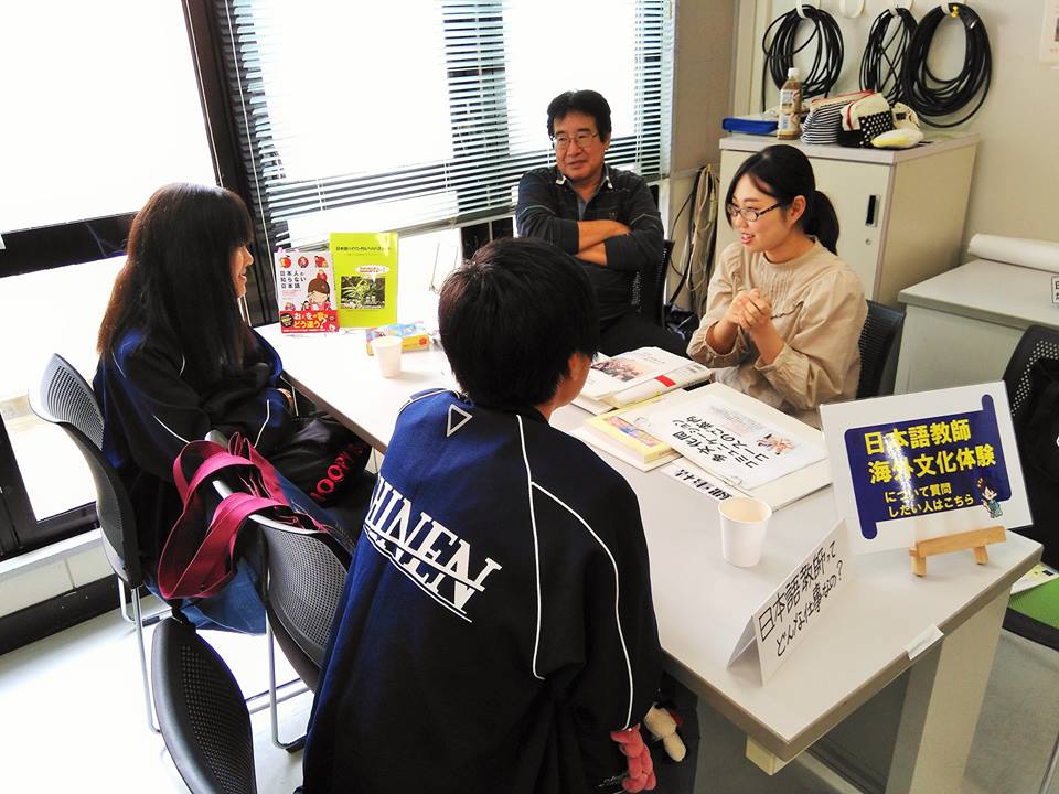 学科ブースでは、国語教員、日本語教師、図書館司書、日本語学・文学、琉球文化、多文化間コミュニケーションなど、学科で学べる様々な専門分野ごとにテーブルを作り、在学生にいろいろ質問できる時間を設けました。