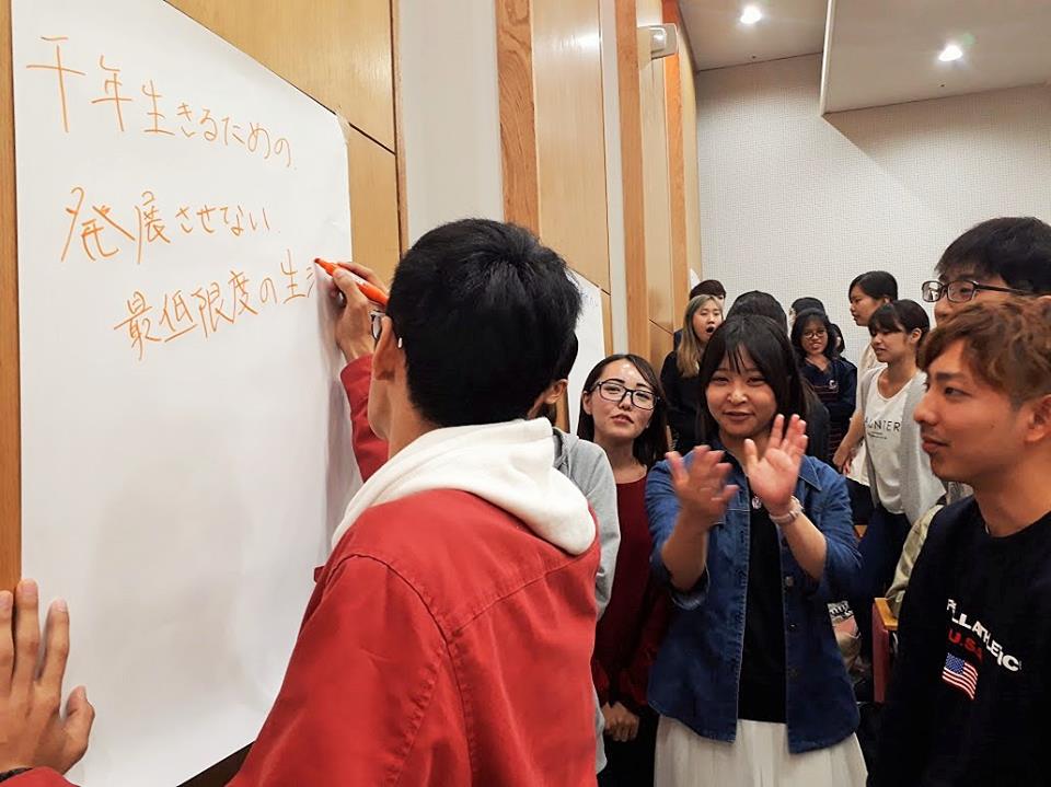 最後には、グループごとにポスター発表を行いましたが、持続可能な社会を創るために、法律や教育、図書館、政治が生まれる過程が再現されたり、倫理の問題、堅実な生き方など、沢山の提案がなされ白熱した時間となりました。
