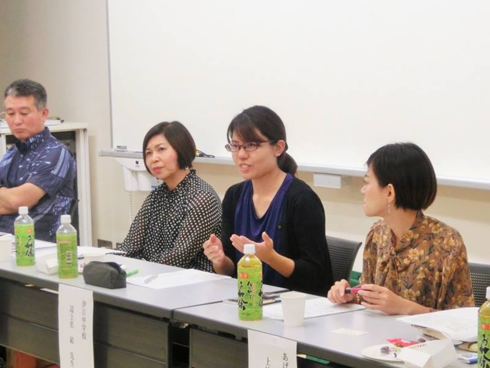 パネリストには、若手教員として日本文化学科卒業生の上地なつき先生、辺土名結先生が登壇され、教科経営・学級経営・部活にテーマを分けて、教職1年目に感じた悩みなどをお話しいただきました。さらに、国語科教師・学校経営・法制度の専門家の先生をお招きして、現在の学校現場の課題と解決のための取り組みや、上地先生・辺土名先生の発言を受けてのご提案をお話しいただきました。