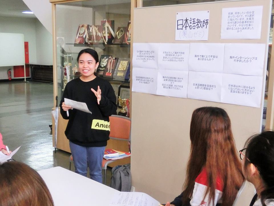 日本文化学科では、2年生必修科目「ゼミナール入門」の中で、3年生から所属する研究室選択の一つとして、各研究室に所属する4年生の先輩たちがどのような4年間を過ごしてどのように進路を決定したかを知るためのイベントとして、4年生による内定者報告会を実施しています。