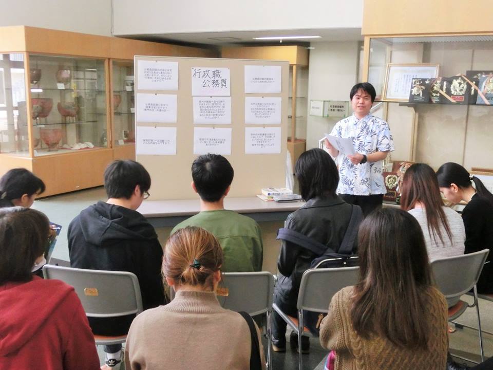 今年度の報告会では、日本文化学科の専門性を生かした職業ということで、国語教師(中学校)、日本語教師(海外)、図書館司書(沖縄県・久米島町)といった資格課程に関わる仕事と、学生から人気が高い公務員、マスコミ関係 (テレビ局)、さらに資格を生かした民間の仕事ということで、書店(県内)に内定した(採用試験に合格した)学生さんにも参加してもらい、5号館ロビーを貸し切りにして、ブースを6つに分けて巡回していく形で実施することにしました。
