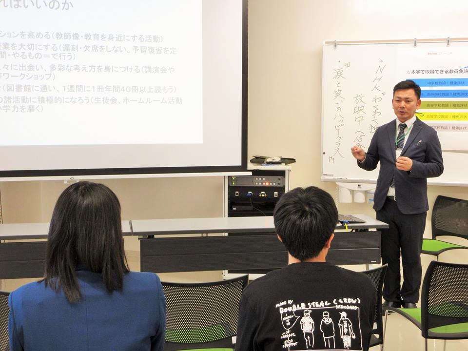 教員になりたい、という受験生さんはたくさんいますが、なったあとのことを考えている生徒さんはそれほど多くありません。国語が好きな人がみんな国語の先生になる必要はないですよね。AO入試等では、「先生になったらこんなことをしたい」と志望動機を深く語ってもらうことになりますが、その志望動機も、学校の先生が社会的にどのような役割・ミッションをになっているか、ということをしっかり考えてから志望動機を語らないと、その動機は大学に進学する理由としては十分にはならない、社会とのつながりを意識して志望動機を考えた上で、教員を志望するかどうかを決めてほしいーーー、田場先生からはそんなアドバイスもありました。