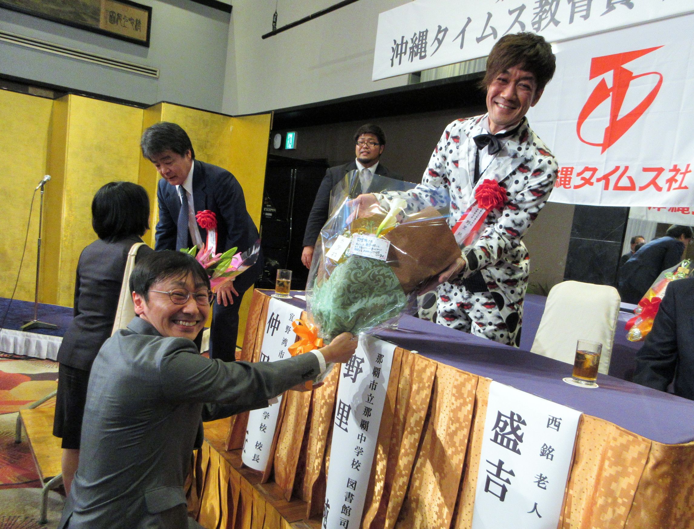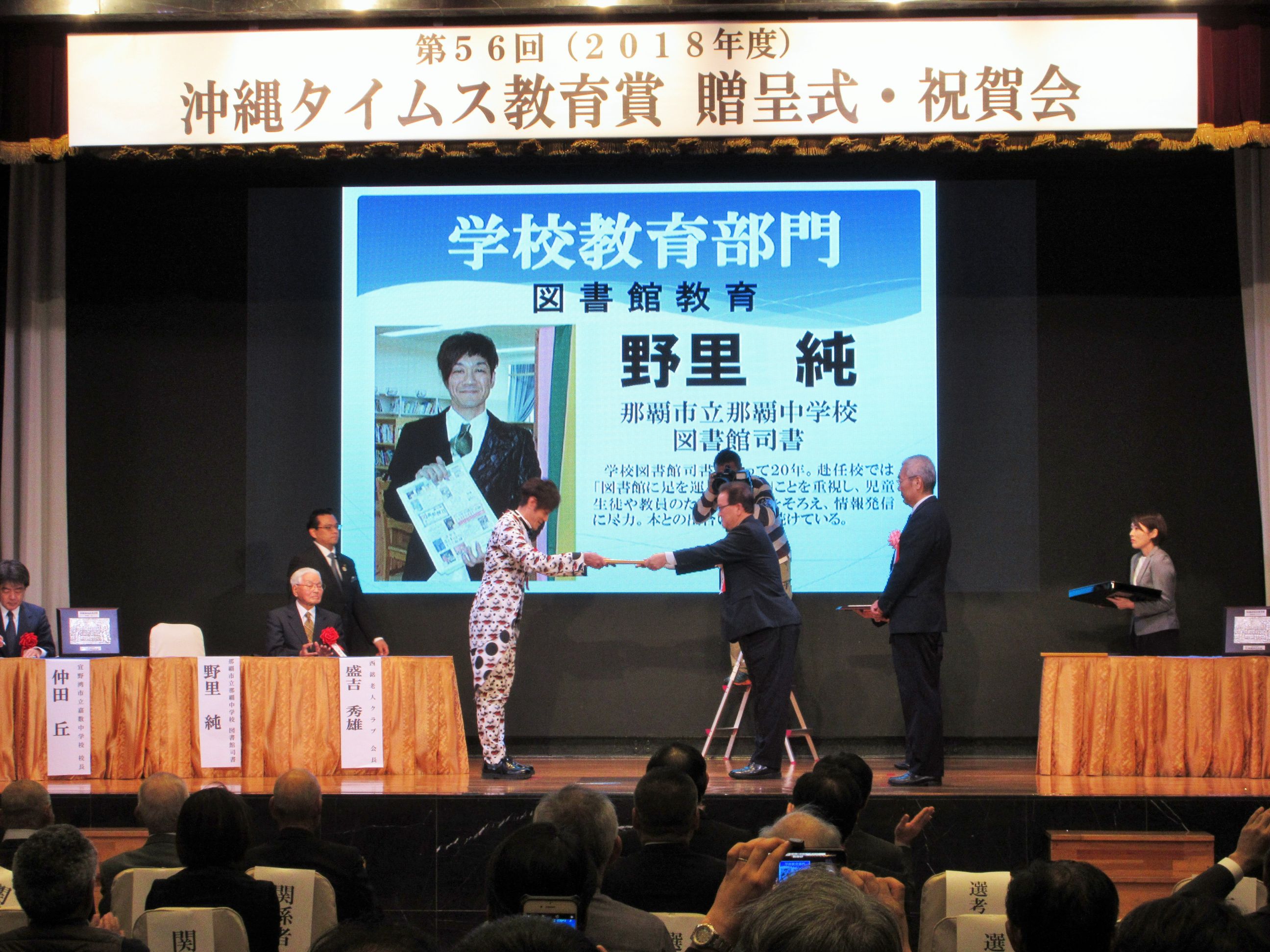 3月18日、長年の図書館教育の実績を認められて受賞された沖縄タイムス教育賞の贈呈式と祝賀会が、かりゆしアーバンリゾート那覇にて開催されました。