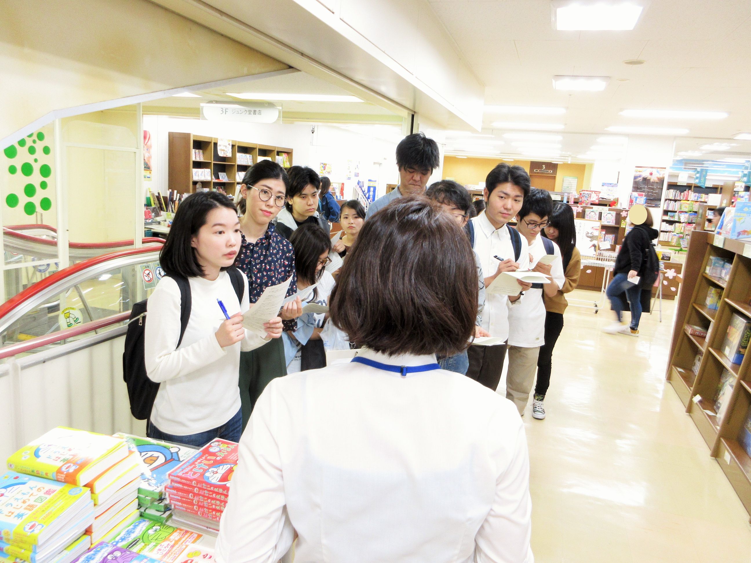 2019年4月17日、ジュンク堂那覇店にお邪魔して、ブックフェアに向けての注意事項や学生たちといっしょにやりたいことなどを、書店員であり、日本文化学科・司書課程の先輩でもある城間さんにレクチャーしていただき、フェアのスペースやイベント会場などを見学させていただきました。