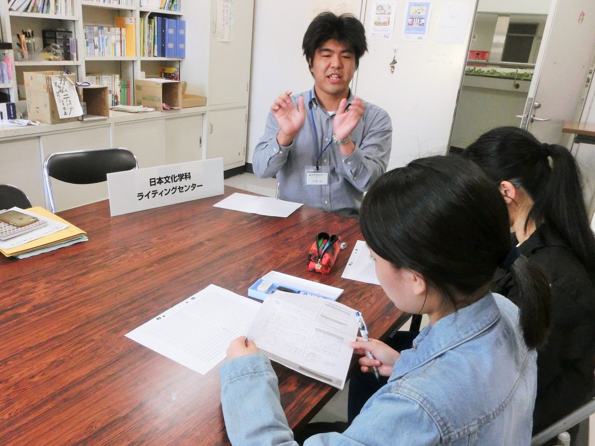 1年生必修科目「リテラシー入門」は「ことばのプロ」を目指すための入門科目です。この授業では、要約文や説明文、意見文の書き方のレクチャーを受けた後、授業で出された課題をもってライティングセンターという施設(共同研究室や図書館学習室)を訪ね、そこでアシスタントによるマンツーマンでの指導を受けることができるようになっています。