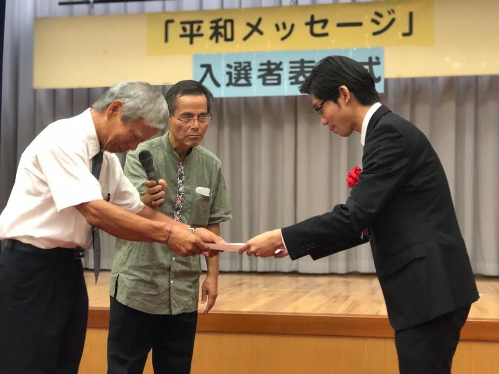 宮森小学校のアメリカ軍機墜落事故から60年。石川・宮森630会という団体がこの60年を節目に募集した「平和メッセージ」のコンテストにおいても、在学中に応募した日文の卒業生2名が以下の賞を受賞し、先日その授賞式が行われました。