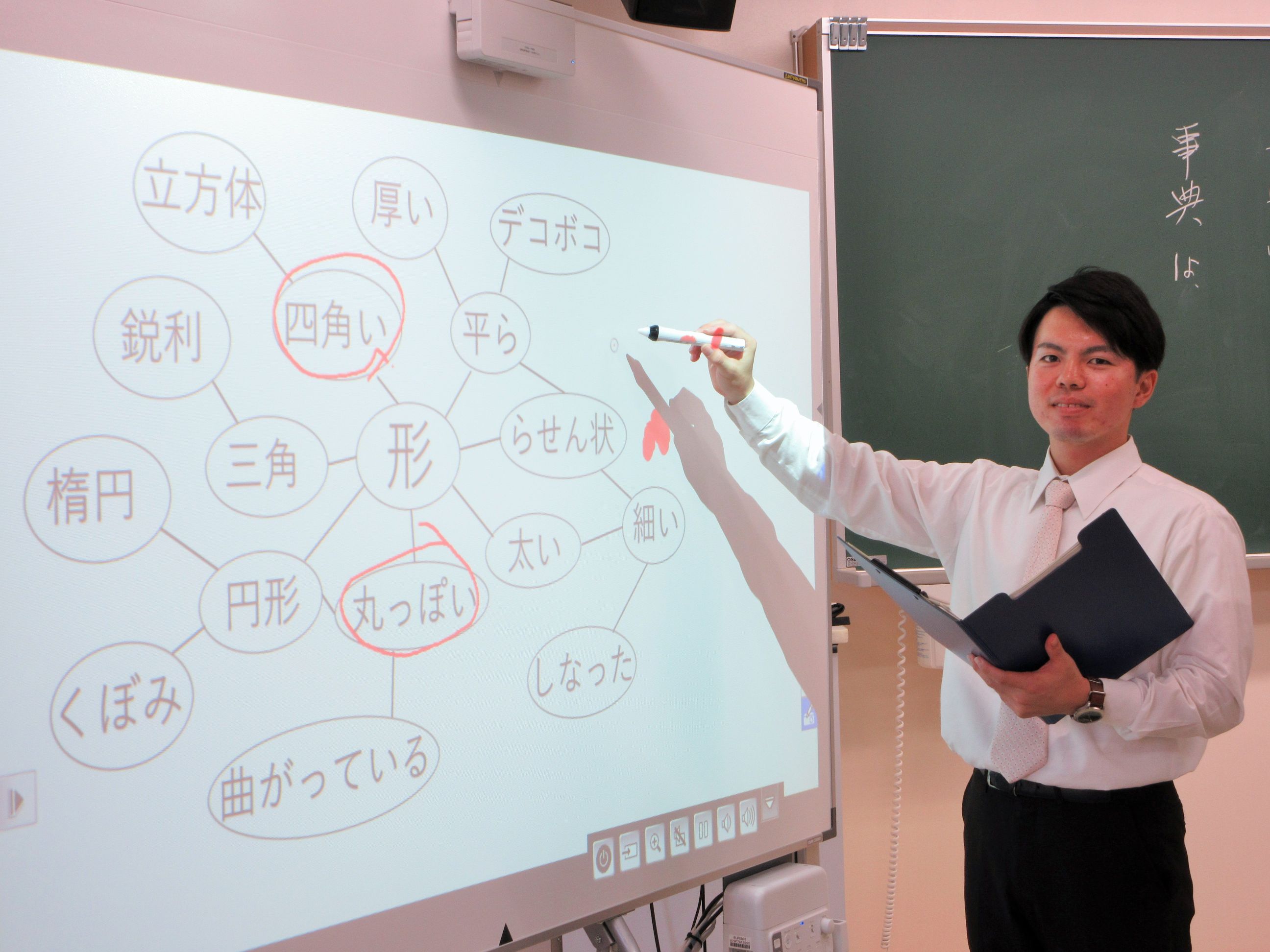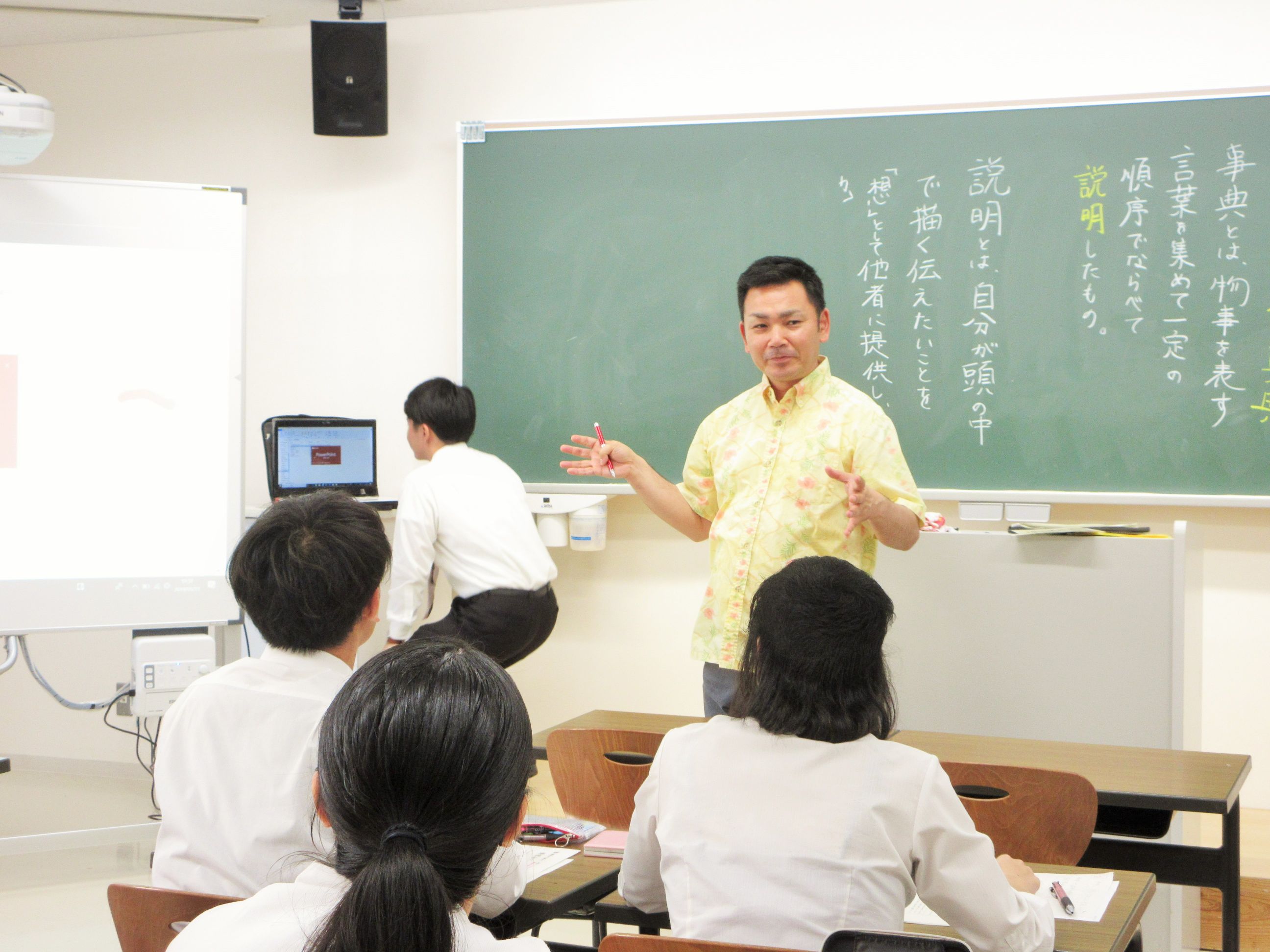 「最初は時間に余裕があるなと思ったが、電子黒板の操作に手間取ったり、話すうちに説明が長くなったり、予定した時間配分での進行がむずかしかった。実際に授業をしてみて、授業内容の構成について課題がみつかった。教師は多忙というイメージから授業の使用したプレゼンテーションも短い時間でつくったため少し不安があった。もう少し工夫していきたい」
