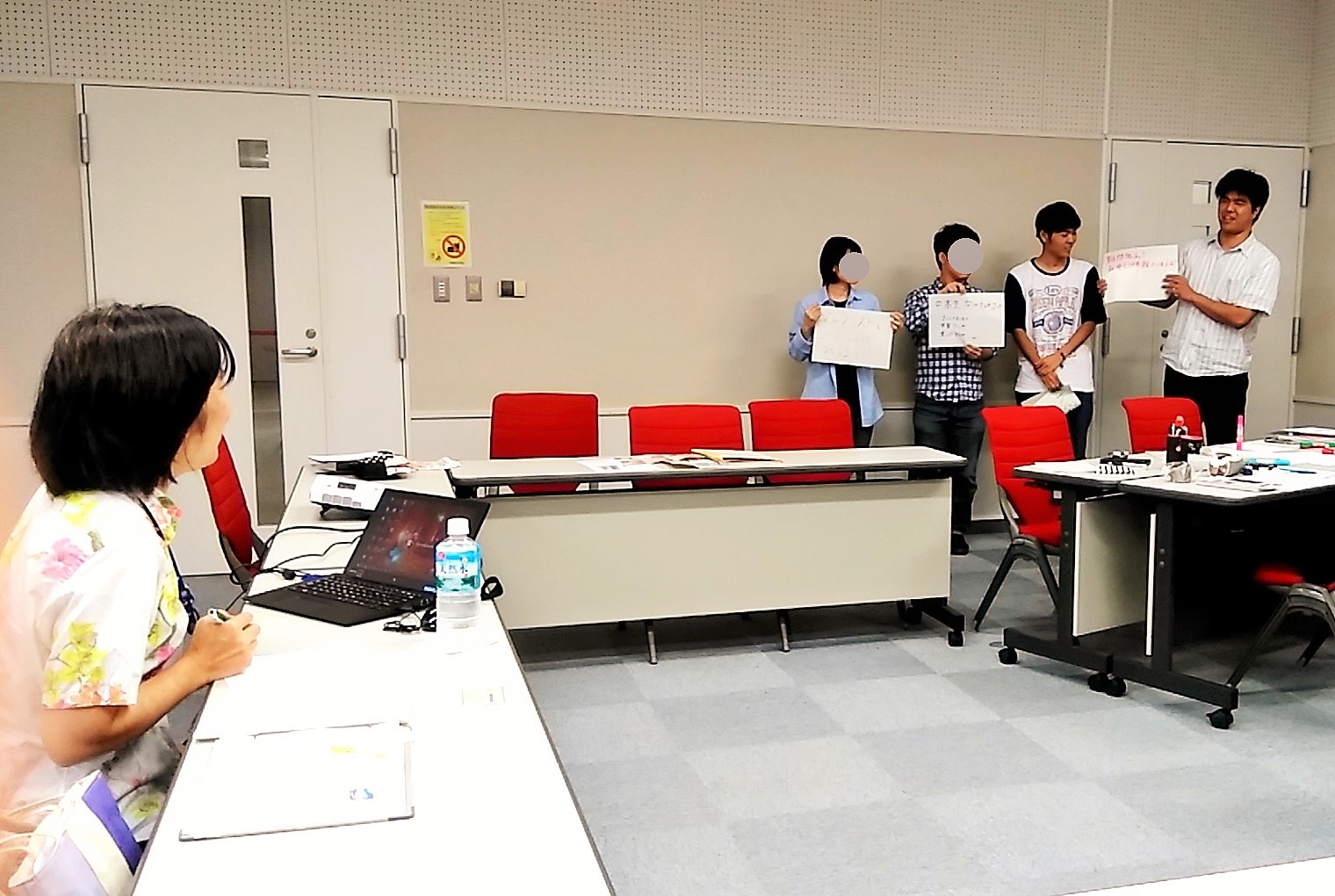 この日は沖縄赤十字病院の患者図書室「健康への架け橋」の司書である久高さんに教室に来ていただき、病院図書室の機能や公共図書館との違い、学生と一緒に取り組んでみたいことなどのレクチャーをしていただき、それをふまえて、2つのグループごとに、患者図書館サービスを向上するための方法をグループディスカッション形式でプレゼンするワークを行いました。