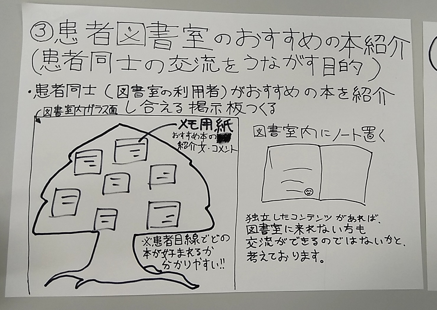学生たちからは、図書室のパンフレットを作って入院患者の説明の際に渡してもらう、「前向きになれる本」「笑いたいときに読みたい本」「あえて泣きたいときに読みたい本」等のテーマごとの棚・ブックリストを作る、夏休みに増える子どもたち向けの本を県立図書館の団体貸出制度を使って取り寄せる、患者の気持ちは患者にしかわからないところもあると思うので、患者通しで本を紹介し合う(この闘病記が役に立ったなど)交流ボードを作る、といった様々なアイディアが提案されました。