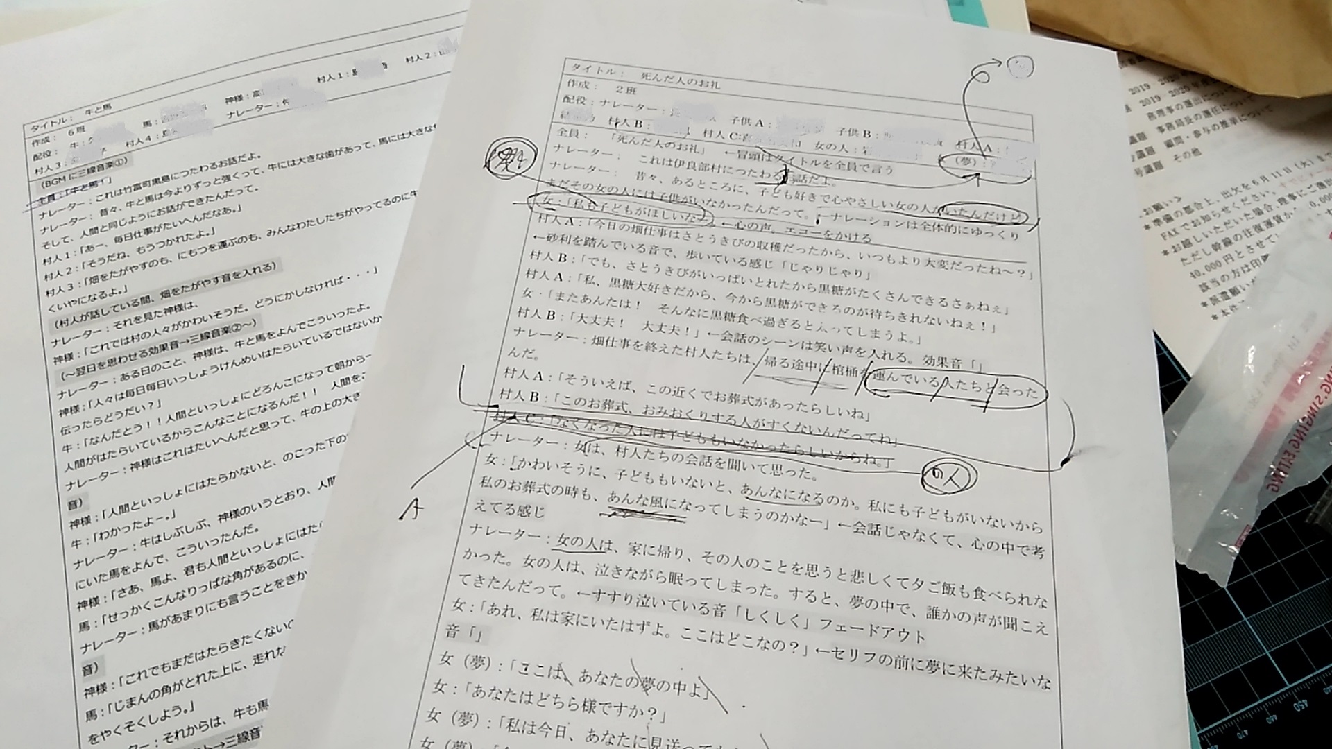 この日のアフレコは「牛と馬」「死んだ人のお礼」という2作品をグループごとに行いましたが、1年生の時に全員で「鬼慶良間」という舞台づくりを経験しているだけあって、サクサクと順調に進みました。