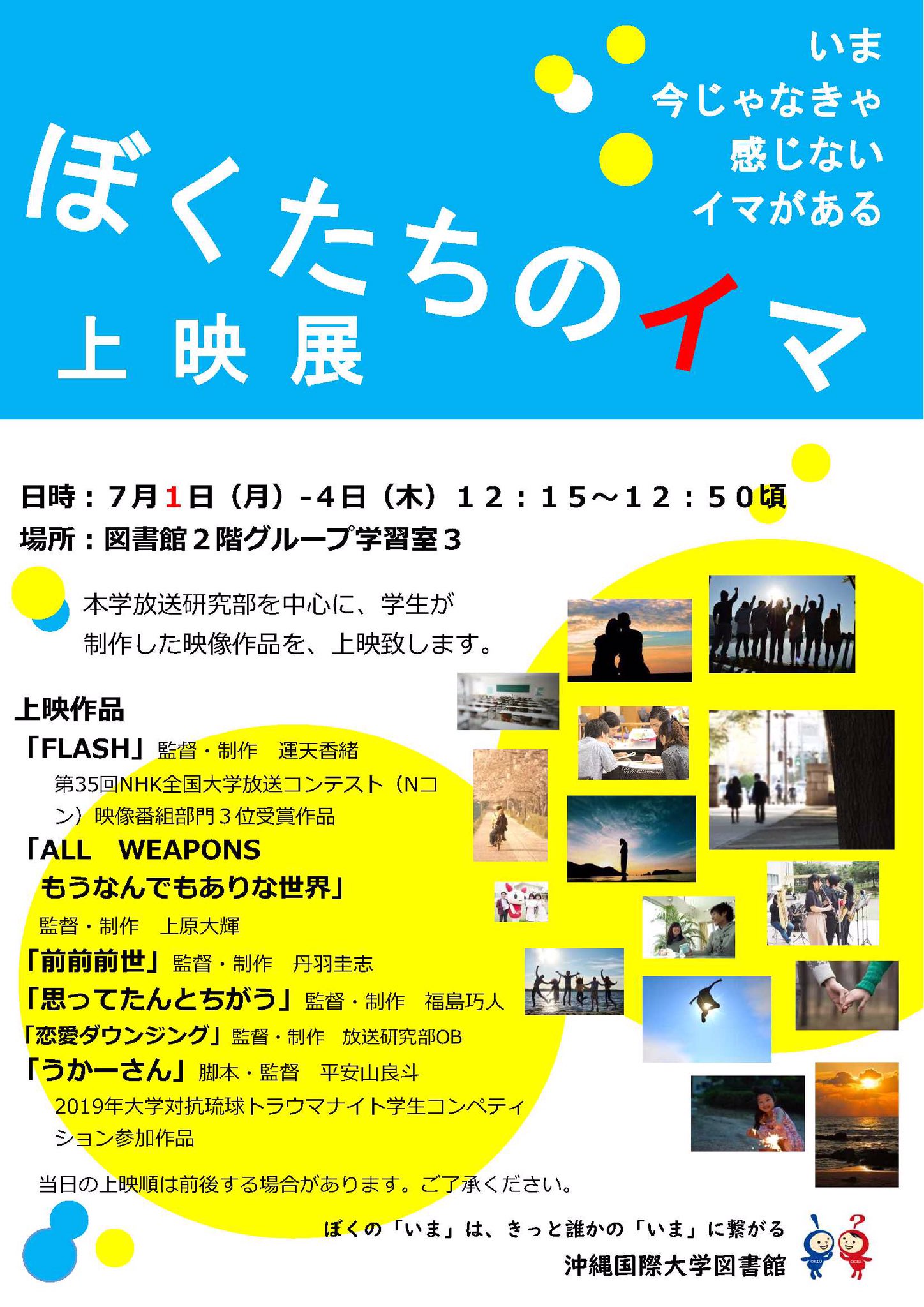 7月1日~4日まで、図書館2Fグループ学習室3にて、12時15分~50分まで。お昼休みを使った上映会です。