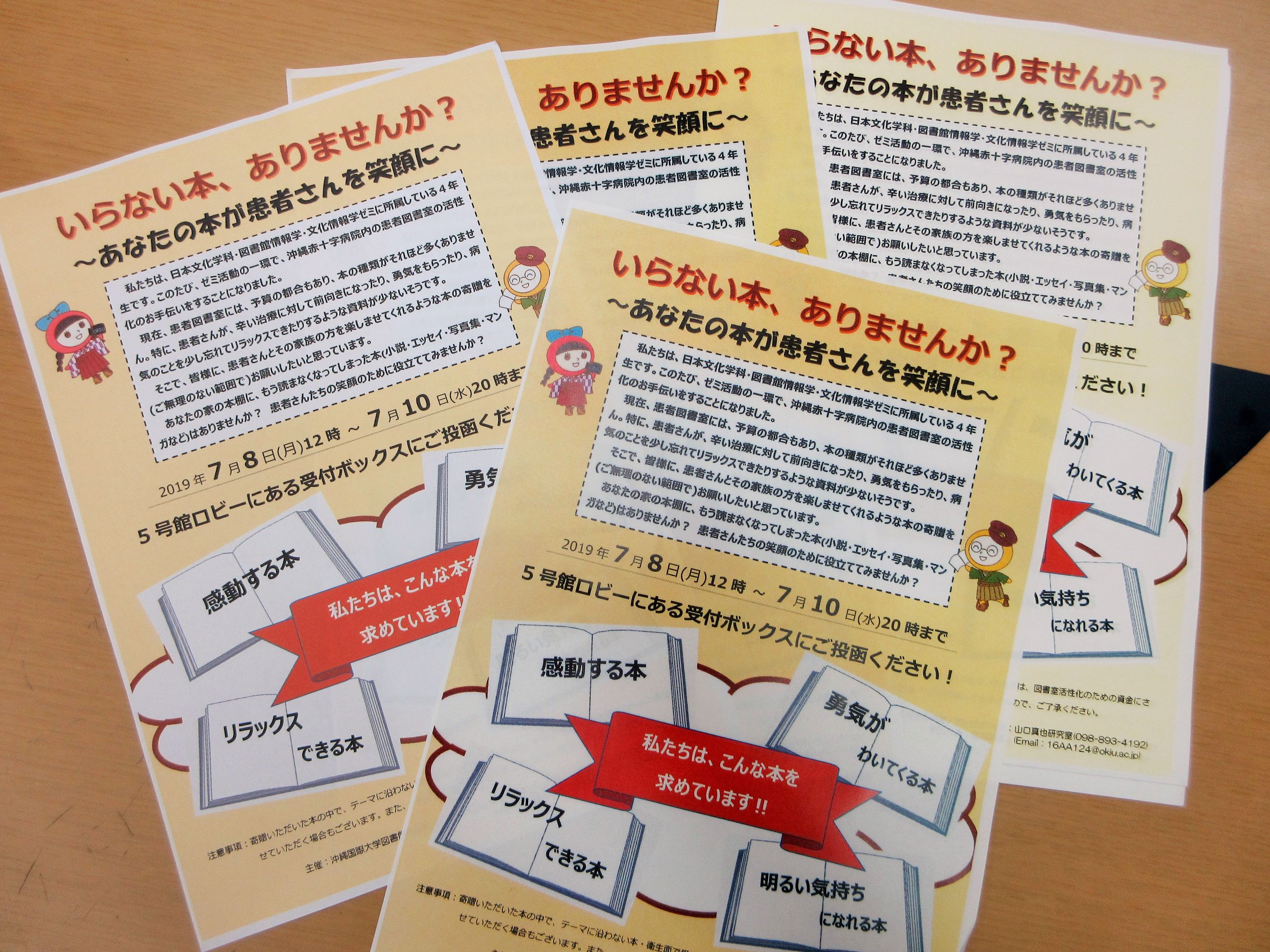 私たちは、日本文化学科・図書館情報学・文化情報学ゼミに所属している4年生です。このたび、ゼミ活動の一環で、沖縄赤十字病院内の患者図書室の活性化のお手伝いをすることになりました。