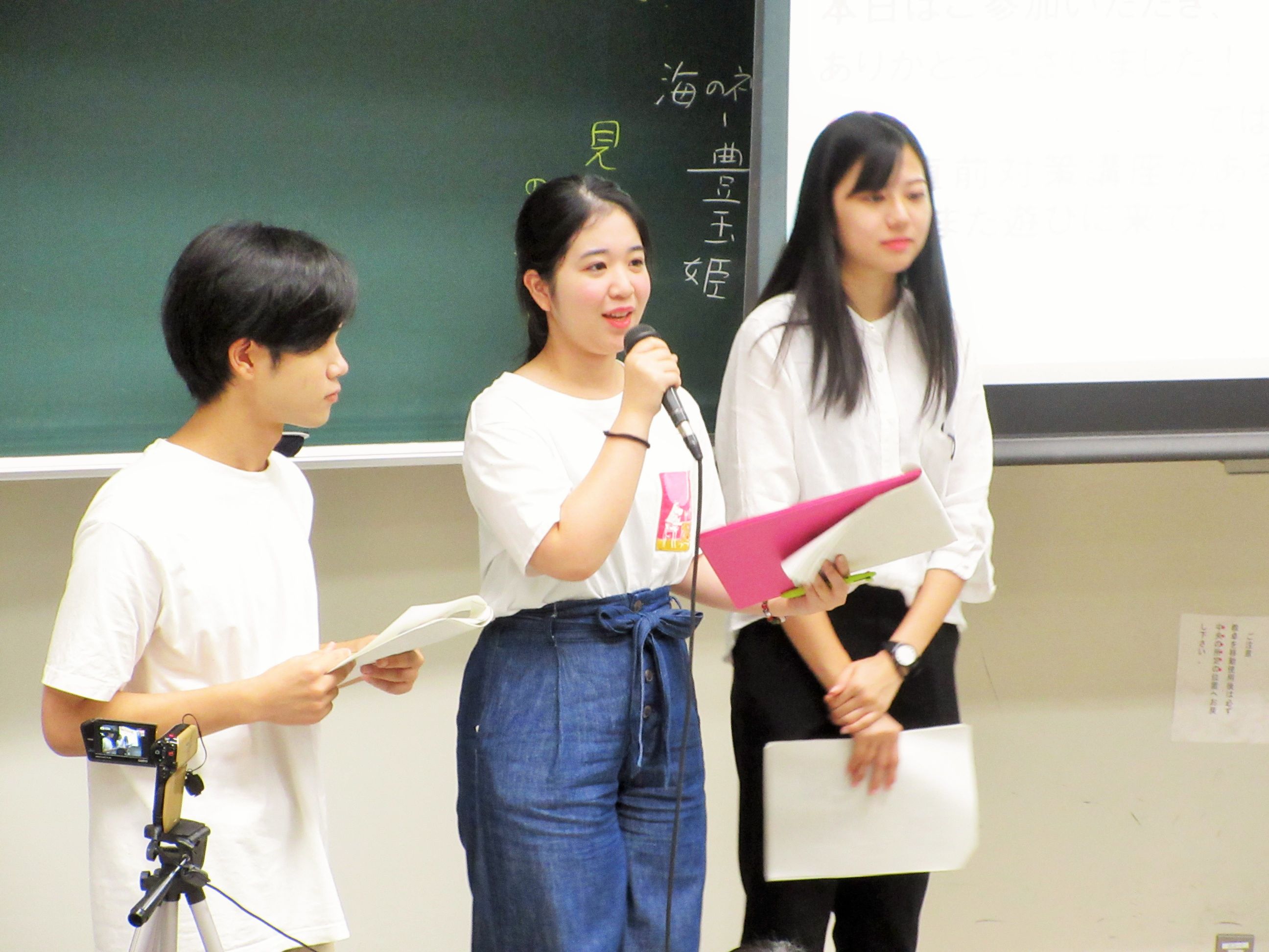 また、日本文化学科の1年生が全員で取り組む舞台づくりの取り組みについても3人から紹介してもらったり、AO入試のアドバイスや受験生へのメッセージも送ったりしました。