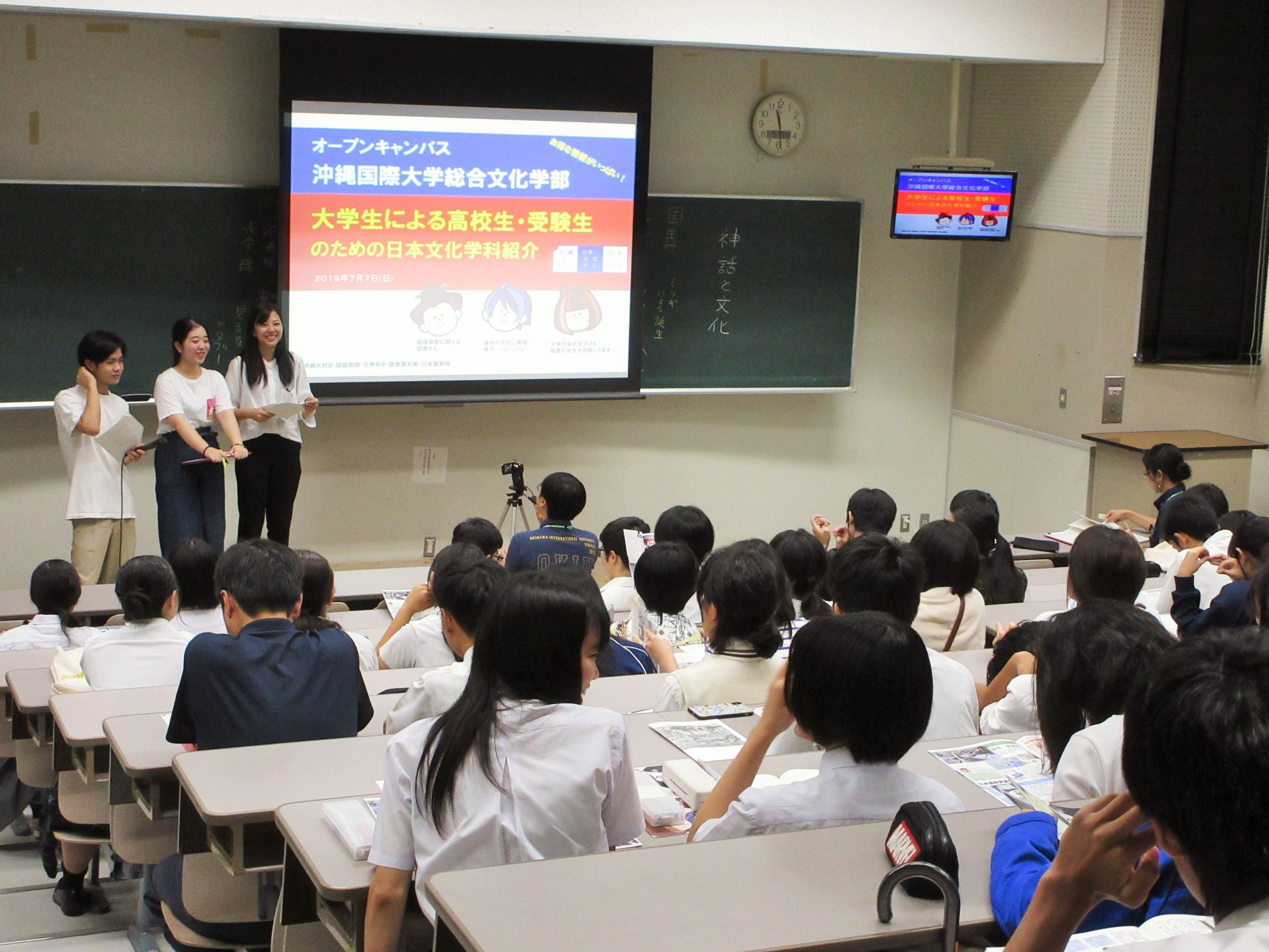 学科紹介では午前中は「大学生による高校生のための学科紹介」と題して、学科パンフレットにもナビゲーター役として登場してくれている2年生の知念さん、上地さん、當間さんの3名に司会進行をお願いして、高校生の頃に自分たちも知りたかったことを学科長に質問する形で進めていきました。