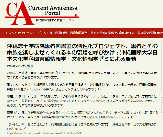 【司書課程の4年生による病院への本の寄贈運動、国会図書館「カレントアウェアネス」に紹介されました!】