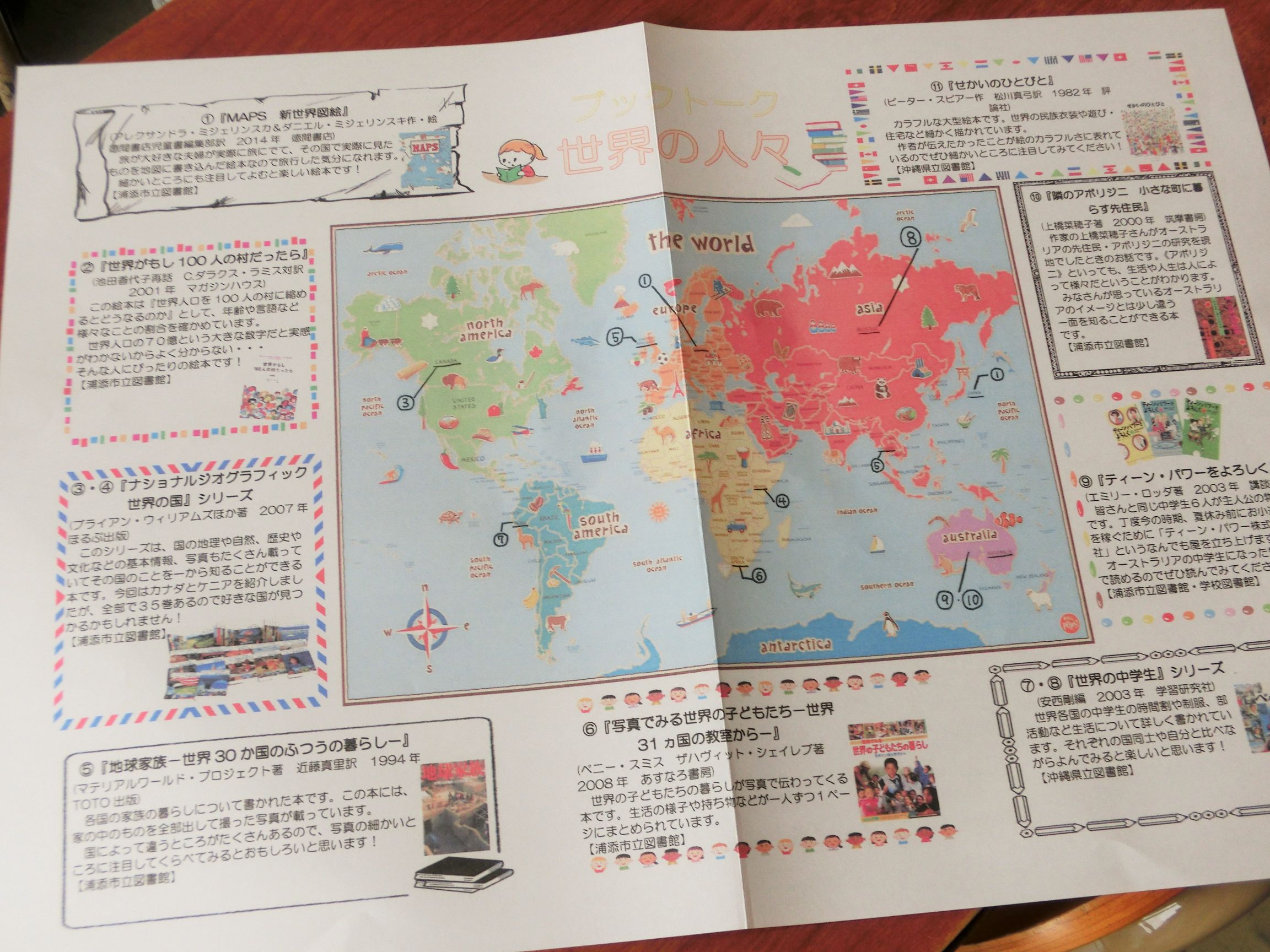 今回は「世界の人々」「身近にあるマークや記号」「夏休みをもっと楽しく」「人生について考える」といったテーマで、『一瞬の風になれ』や『どんなにきみがすきだかあててごらん』『日本の海大百科』『虹色ほたる』『隣のアボリジニ』『世界がもし100人の村だったら』『地球家族』『MAPS 新世界図絵』『ティーン・パワーをよろしく』など、読みやすい小説から、地図の本、絵本、自然科学の本、エッセイ集などなど、たくさんの本を紹介しました。